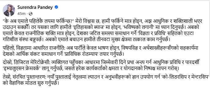 नेता पाण्डेले सामाजिक सञ्जाल फेसबुकमार्फत आफ्नो धारणा राख्दै लेखेका छन्,”के अब एमाले पहिलेकै लयमा फर्किन्छ?” मेरो विश्वास छ, हामी फर्किने मात्र होइन, अझ आधुनिक र शक्तिशाली भएर उदाउन सक्छौँ। तर यसका लागि हामीले ‘इतिहासको ब्याज’ मा होइन, ‘भविष्यको लगानी’ मा ध्यान दिनुपर्छ। अबको एमाले केवल राजनीतिक शक्ति मात्र होइन, देशका जटिल समस्या समाधान गर्ने ‘विज्ञता र प्रविधि’ सहितको एउटा गतिशील संस्था बन्नुपर्छ। अबको एमाले बचाउन हामीले तीनवटा मुख्य क्षेत्रमा तत्काल काम गर्नुपर्छ।