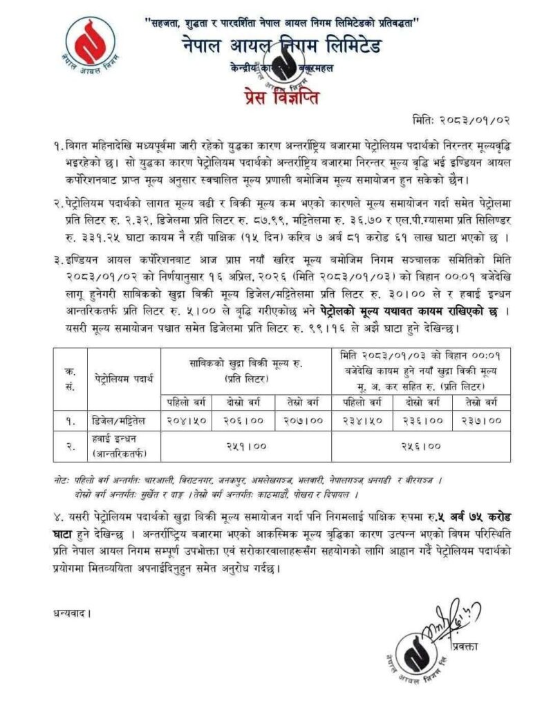 अन्तर्राष्ट्रिय बजारमा इन्धनको मूल्यमा भएको उतारचढावका कारण मूल्य समायोजन गर्नुपरेको निगमले जनाएको छ।