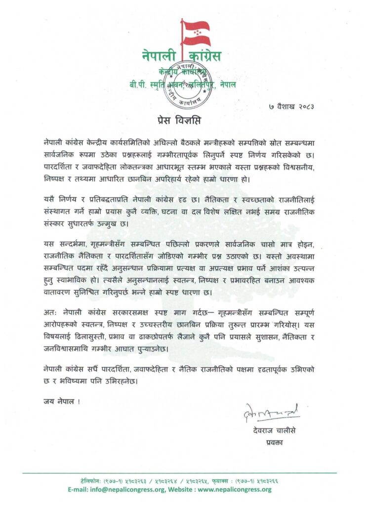 कांग्रेसले सरकारसमक्ष गृहमन्त्रीसँग सम्बन्धित सम्पूर्ण आरोपहरूको स्वतन्त्र, निष्पक्ष र उच्चस्तरीय छानबिन प्रक्रिया तुरुन्त सुरु गर्न स्पष्ट माग गरेको छ।विज्ञप्तिमा थप भनिएको छ कि यस्तो विषयमा ढिलासुस्ती, प्रभाव वा ढाकछोप गर्ने प्रयासले सुशासन, राजनीतिक नैतिकता र जनविश्वासमा गम्भीर क्षति पुर्याउनेछ।